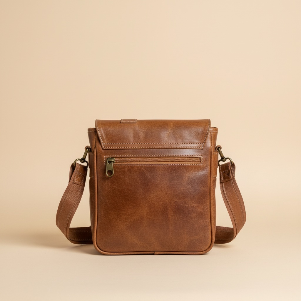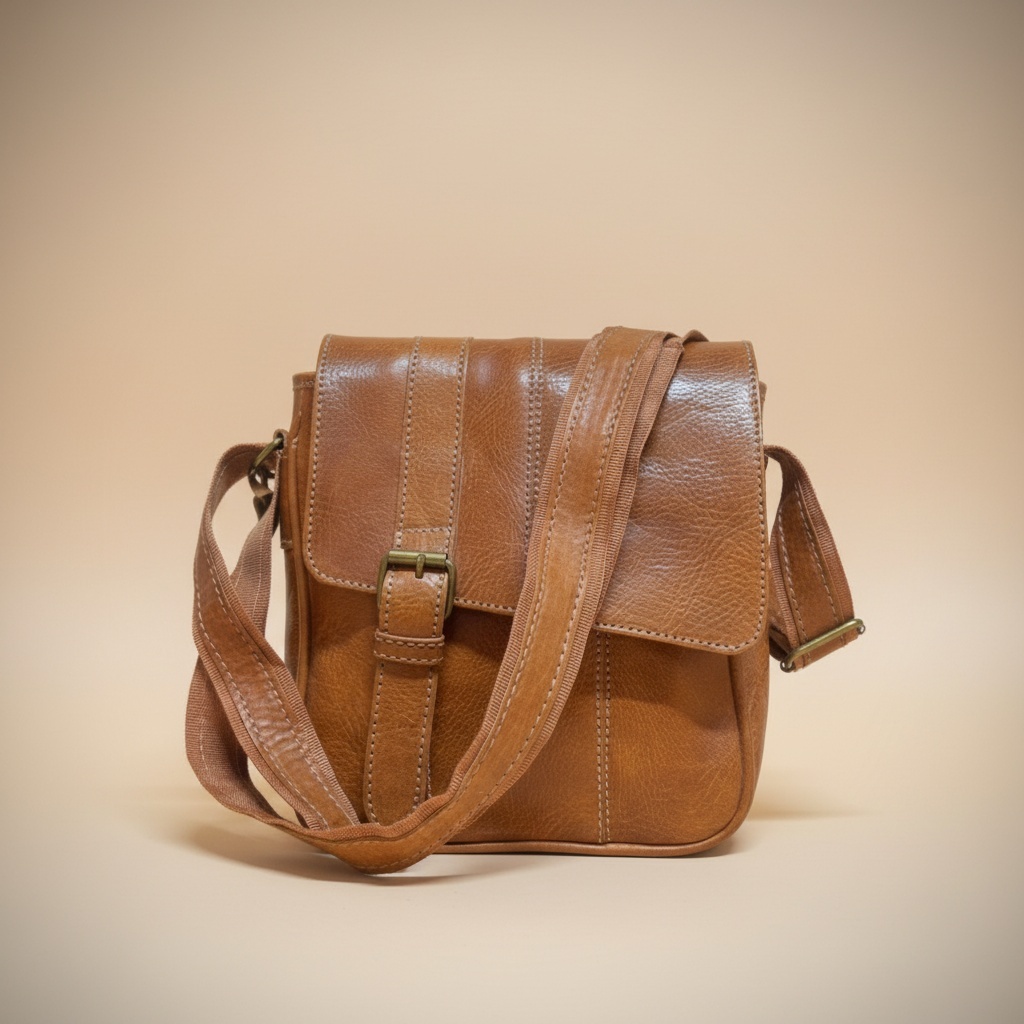 – Particularité : Style vintage et rustique avec un aspect vieilli et une patine naturelle. Fermeture à rabat sécurisée par une sangle en cuir et une boucle métallique décorative. Surpiqûres visibles ajoutant une touche artisanale unique. Format compact et discret.