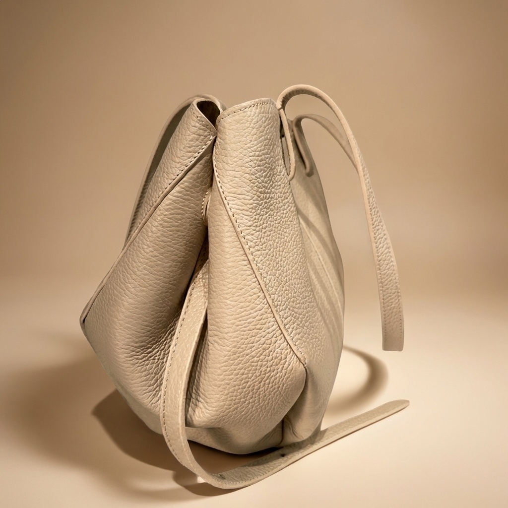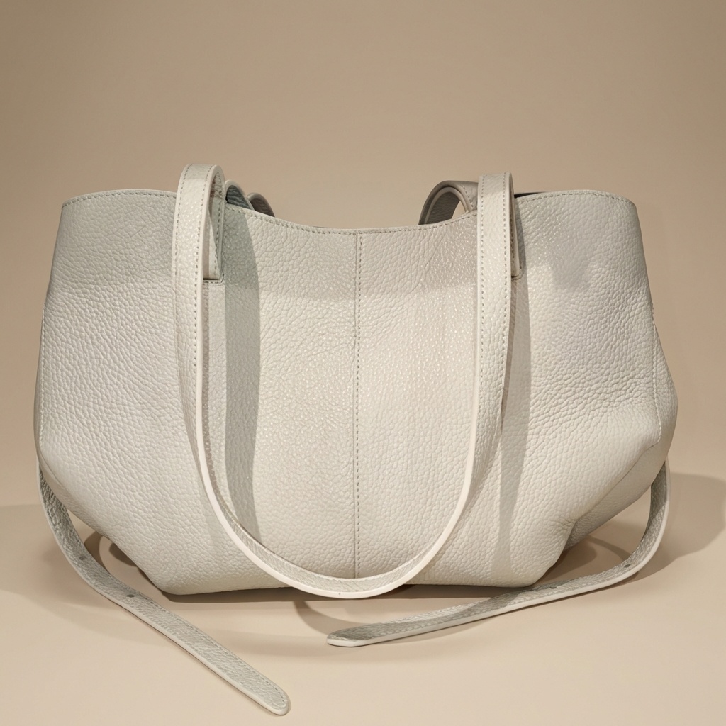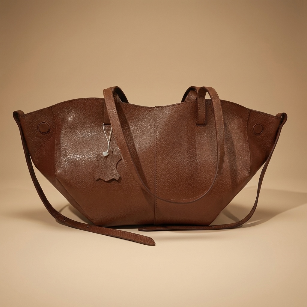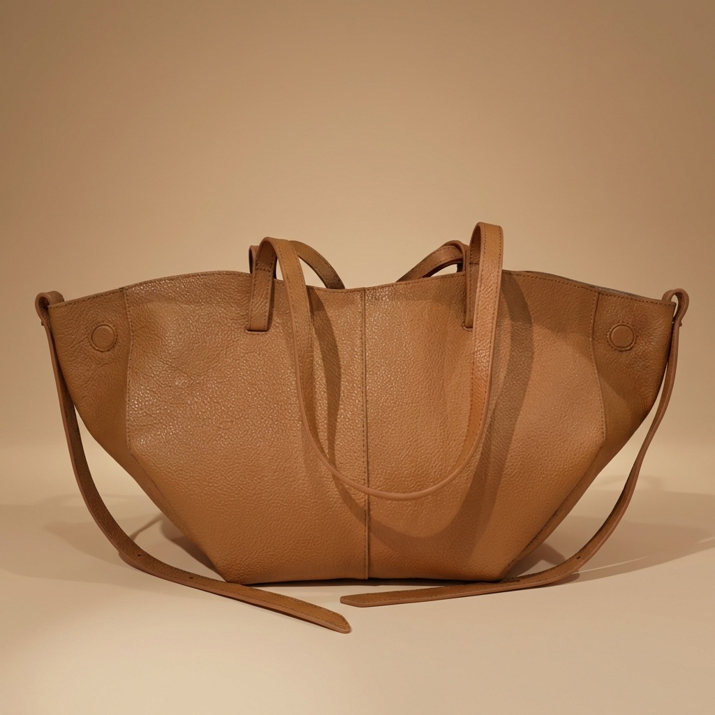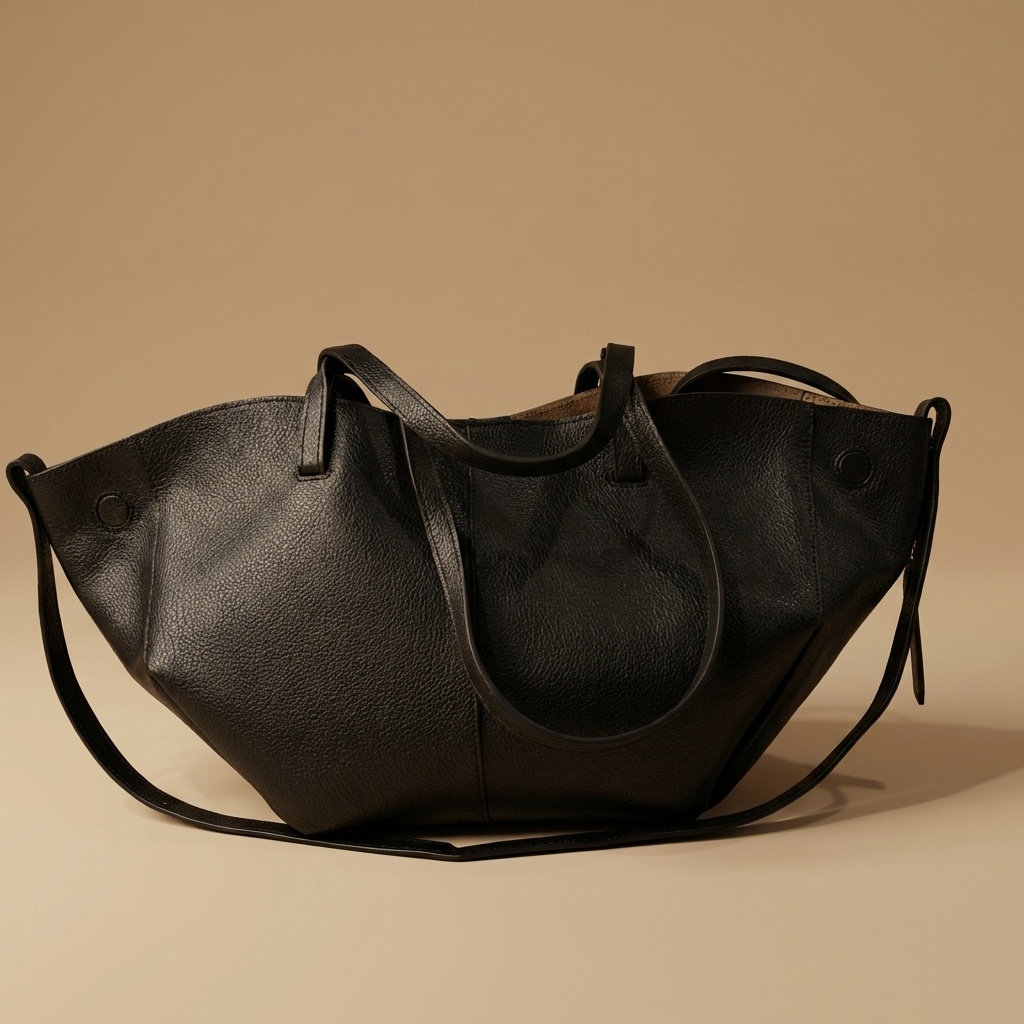 – Particularité : Un design unique de type fourre-tout avec une silhouette évasée et une large ouverture aux bords incurvés. Il se distingue par son cuir grainé à effet galet, ses coutures ton sur ton précises, ses panneaux frontaux avec coutures verticales, et ses disques plats intégrés aux extrémités latérales supérieures.