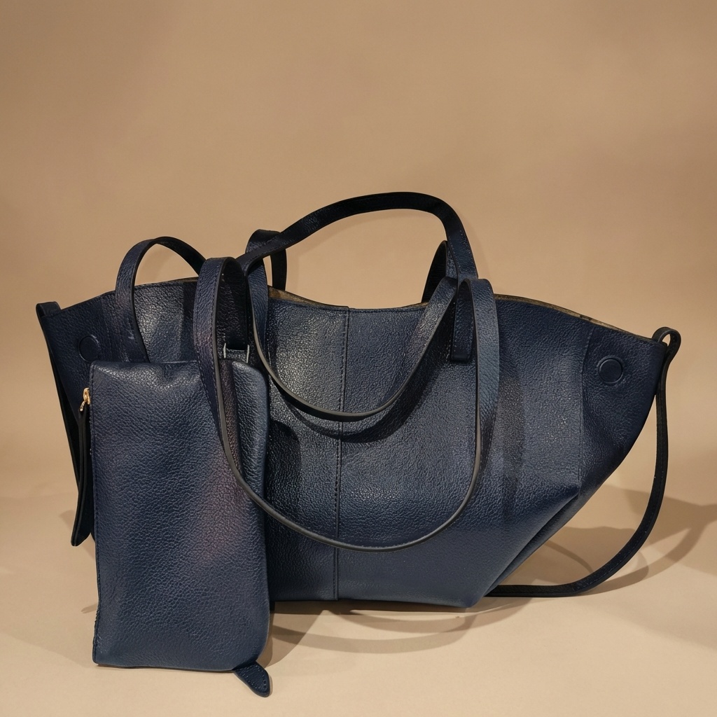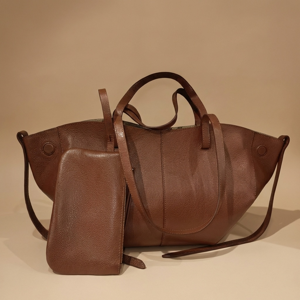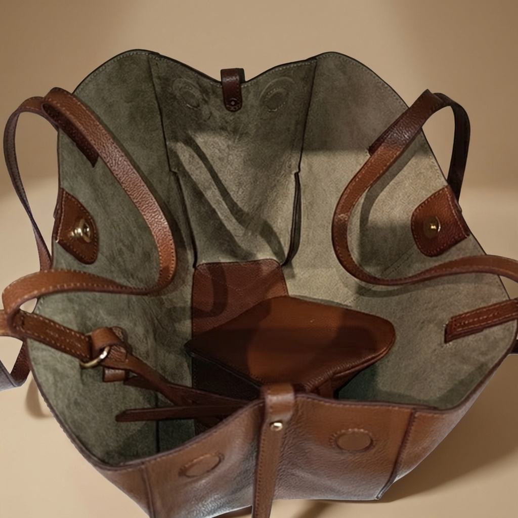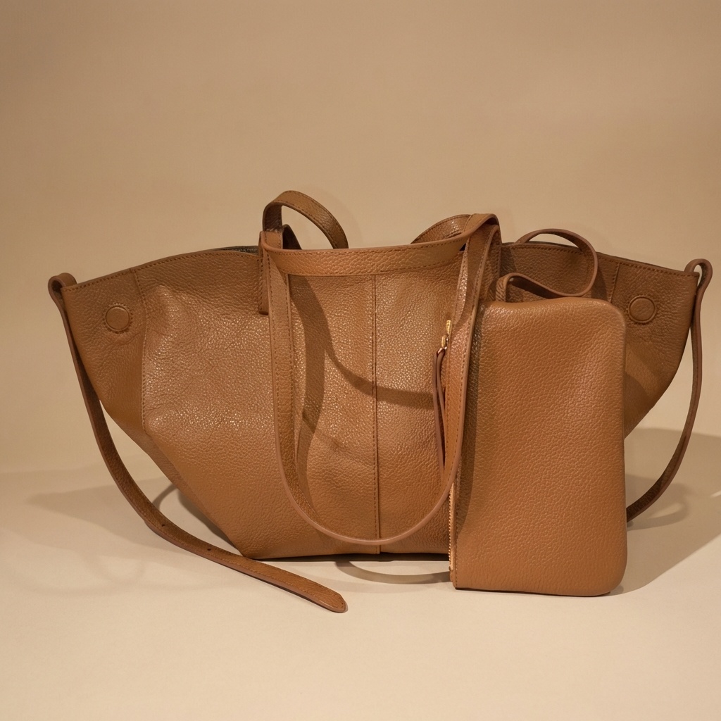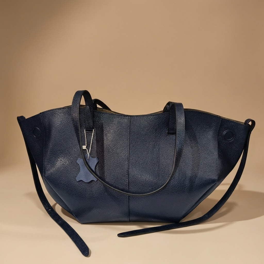 – Particularité : Un design unique de type fourre-tout avec une silhouette évasée et une large ouverture aux bords incurvés. Il se distingue par son cuir grainé à effet galet, ses coutures ton sur ton précises, ses panneaux frontaux avec coutures verticales, et ses disques plats intégrés aux extrémités latérales supérieures.