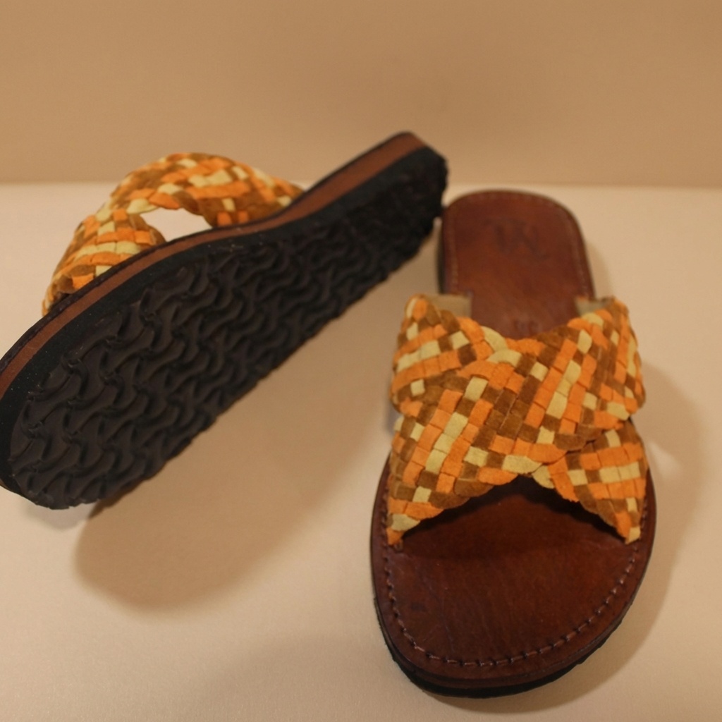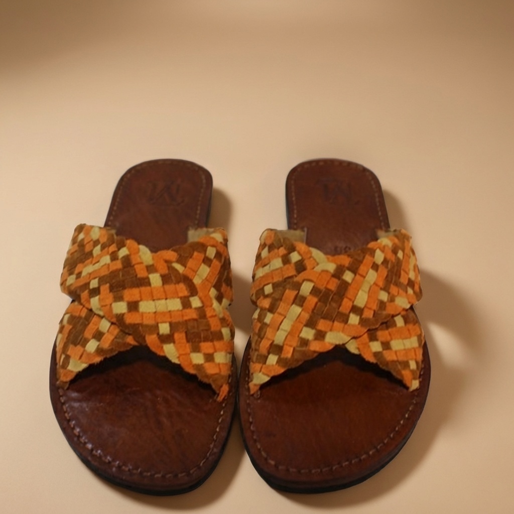 – Particularité : Large empeigne tissée croisée de type « basketweave » en tons orange et beige, offrant une texture et un détail uniques et intemporels.