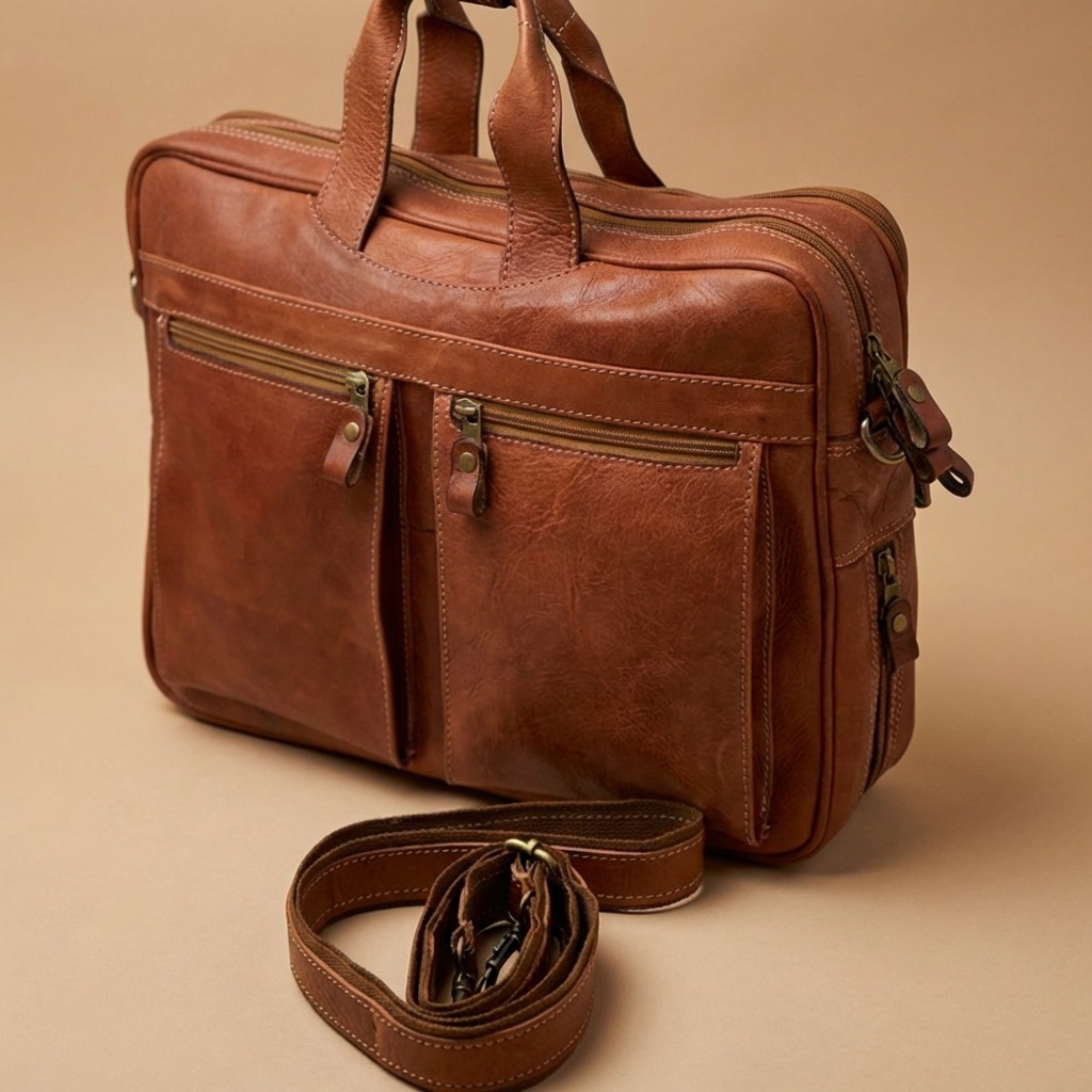 Cartable en cuir de veau tanné à la main, idéal pour un usage professionnel et académique, alliant style vintage et fonctionnalité moderne.
