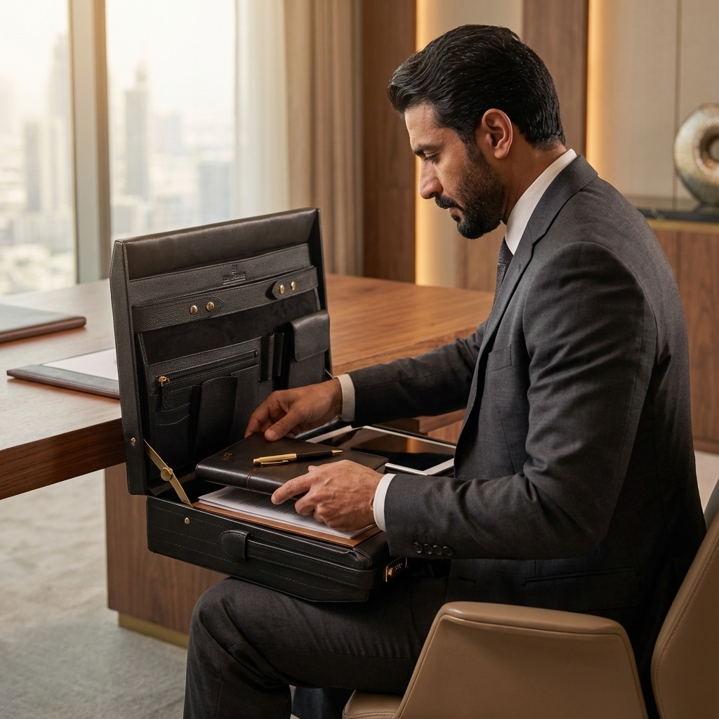 – Particularité : Structure rigide (« Hard-shell ») qui conserve sa forme et protège efficacement son contenu, serrures à combinaison métalliques robustes pour une sécurité accrue, organisation interne optimisée avec soufflets pour documents, fentes pour stylos et cartes de visite, compartiments pour téléphone et une poche zippée. Incarnation du savoir-faire artisanal marocain avec des finitions soignées.