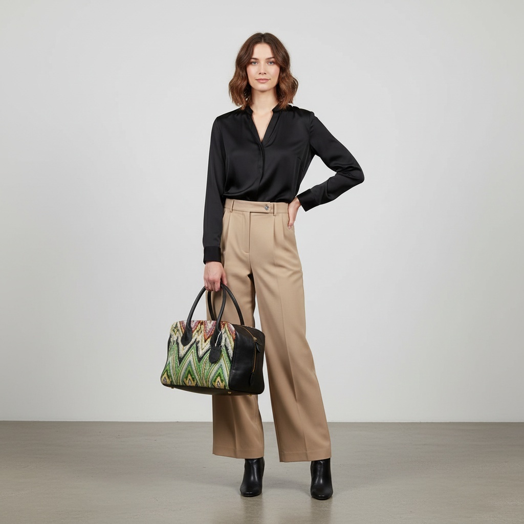 – Particularité : Design alliant l’élégance du cuir lisse à un tissu tissé aux motifs géométriques vibrants ; forme bowling classique intemporelle ; équipé d’une fermeture principale zippée.