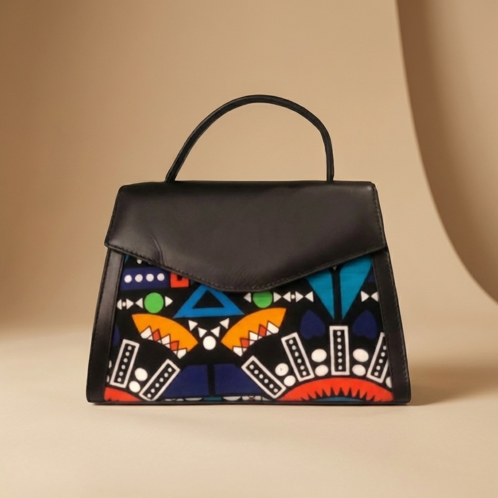– Matière : Cuir lisse pour le rabat et les côtés, tissu imprimé pour le panneau central.